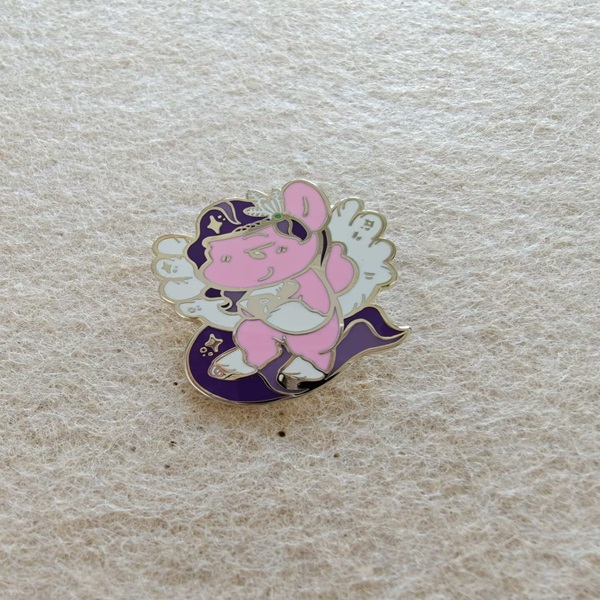 This is a cute enamel pin featuring a whimsical, stylized character