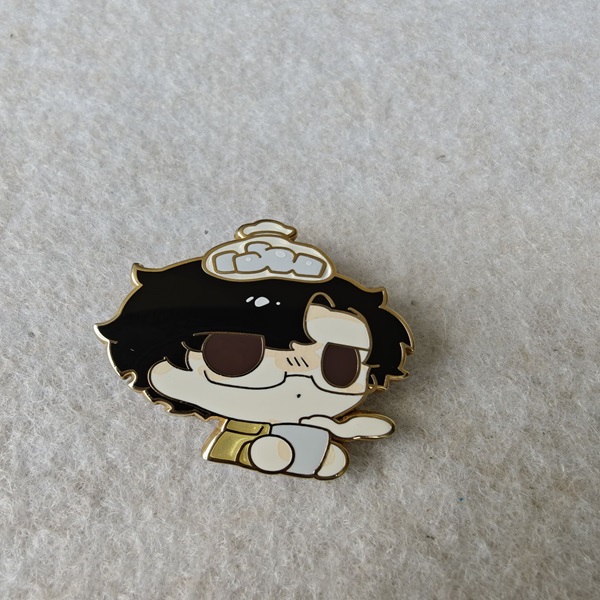 This product is a cute enamel pin featuring a chibi-style character. The character has short,