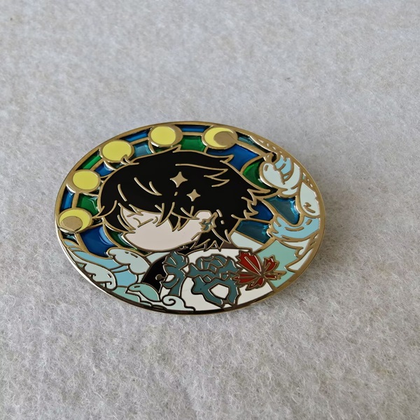 This is an enamel pin featuring a chibi-style character with black, spiky hair adorned with star details.
