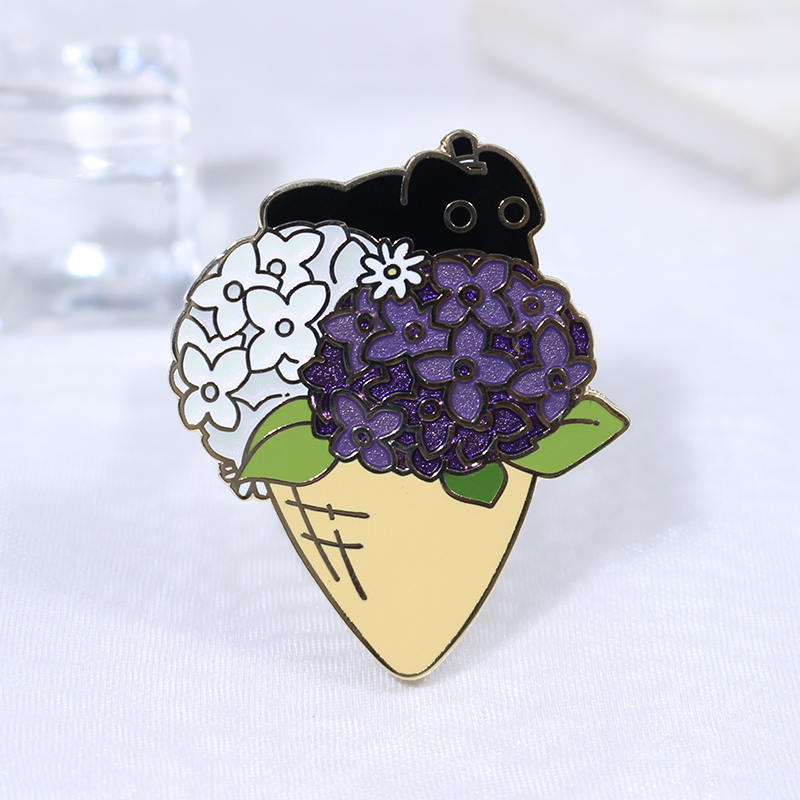This hard enamel pin features a cute black cartoon animal (with a simple, rounded silhouette and adorable eyes) combined with hydrangeas and cone shapes, creating a playful scene of “animals hiding behind a bouquet.”