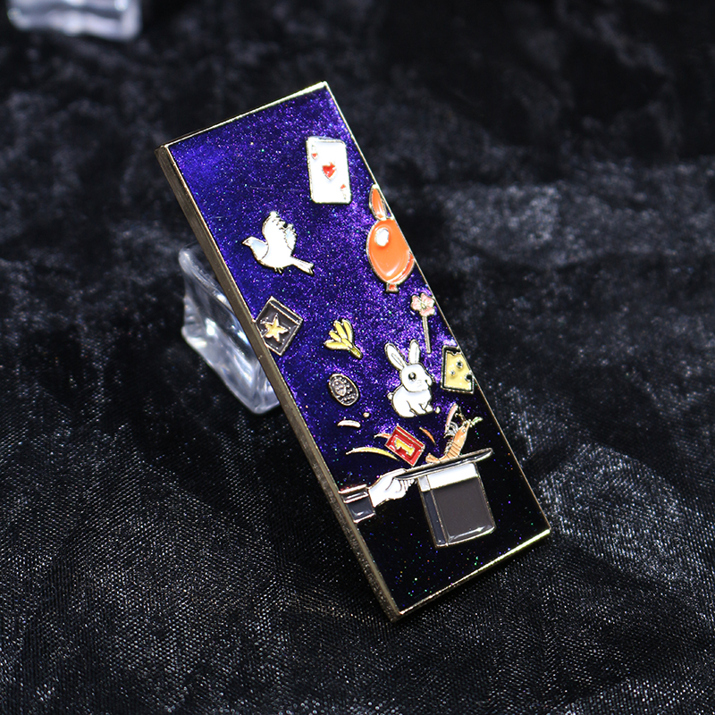 This is a magic-themed cat eye soft enamel pin. The image features a magician’s hands and a top hat, from which elements such as a white rabbit, carrot, playing cards (Ace of Hearts), a white dove, balloons, star-shaped cubes, and flowers “conjure” themselves, creating the illusion of a spectacular magic show. It’s full of imagination.
