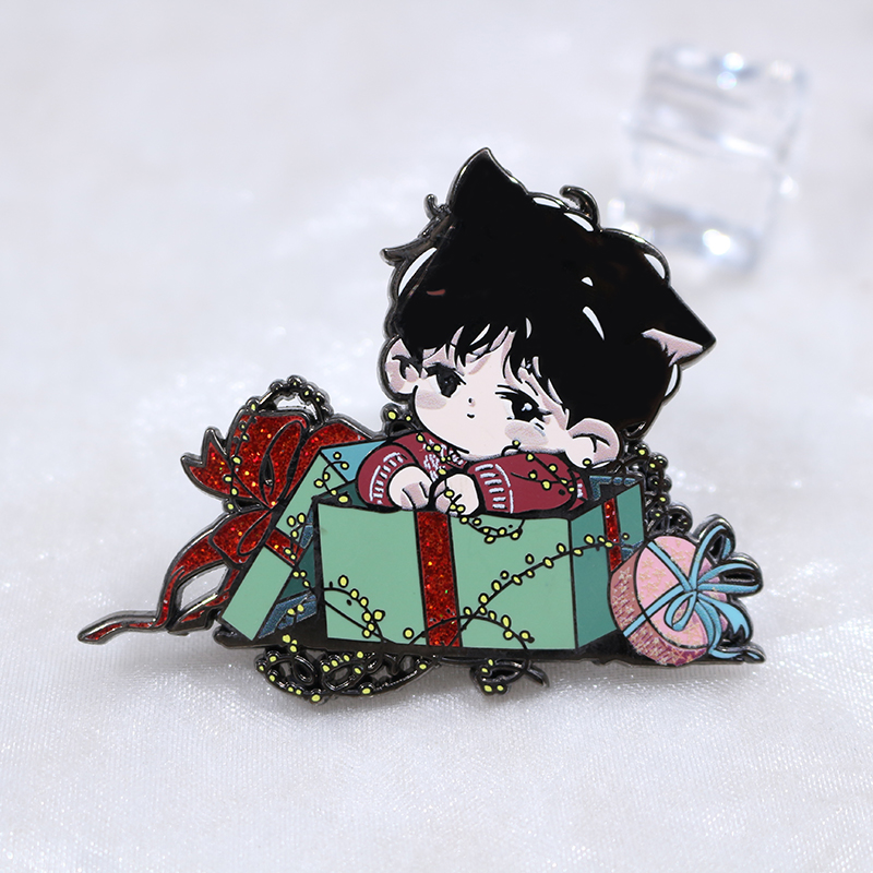 This is a lovely hard enamel pin featuring a black-haired, cat-eared cartoon character wearing a red top with white stripes. She’s peeking out of a green gift box with a red glitter ribbon. The box is dotted with small yellow flower branches, and next to it is a small pink gift box with a blue bow. The overall look is full of Christmas cheer, with vibrant and layered colors. The glitter details add a vibrant sheen.