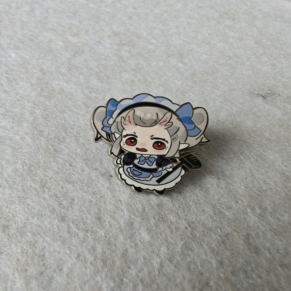 This is an enamel pin featuring a cute chibi – style character. The character has light – colored hair adorned with blue bows and wears a maid outfit in shades of blue and white.