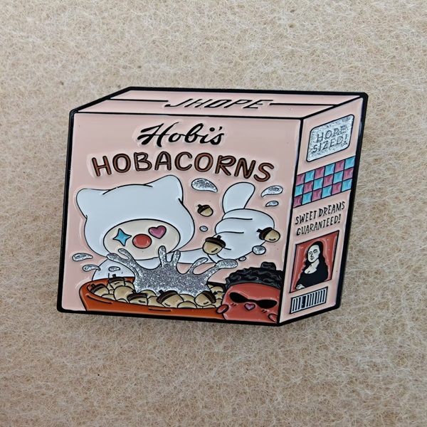This is a J-Hope (BTS) themed enamel pin designed to look like a cereal box, named “Hobi’s Hobacorns”.