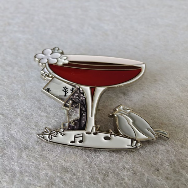 this is an enamel pin with a creative and intricate design. The central element is a wine glass filled with red enamel,